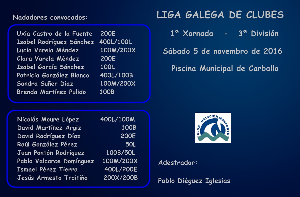 ConvocatoriasLiga Galega de Clubes / 3ª División 4 noviembre, 201623 enero, 2017 Club Natación Monforte Resultados por proba Liga Galega de Clubes. 1ª Xornada (FEGAN) Resultados totales: Series 1ª xornada Publicado por Club Natación Monforte Ver todas las entradas de Club Natación Monforte