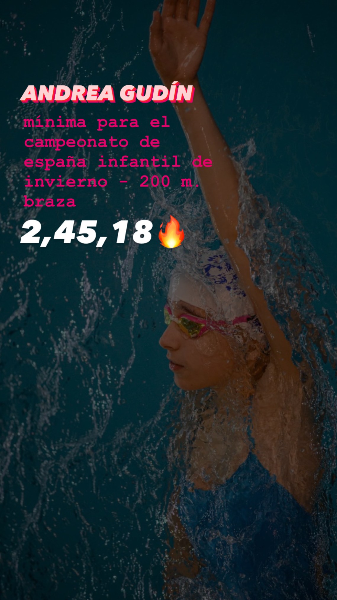 Además, Andrea Gudín Pérez ha superado la marca mínima para el campeonato de España infantil de invierno en la prueba de 200m braza con un tiempo de 2’45″18. Enhorabuena!!